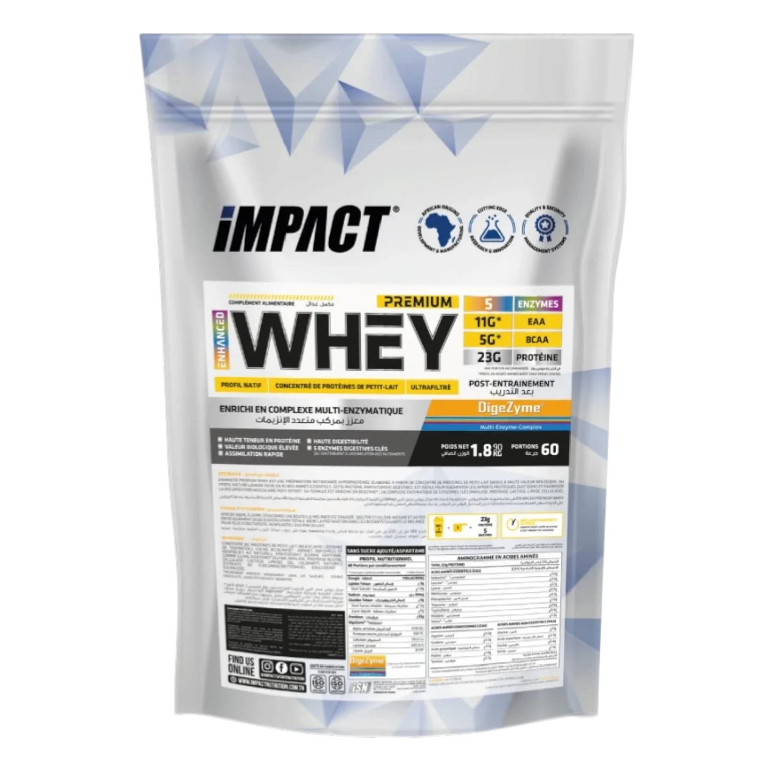 Le format sachet de la Premium Whey Enhanced a été conçu pour les athlètes actifs en Tunisie qui ne veulent pas sacrifier leur nutrition lors de leurs déplacements. Chaque dose délivre 11g d'EAA et 5g de BCAA avec un aminogramme natif garanti sans 'amino-spiking'. Grâce à l'intégration des 5 enzymes digestives (Lactase, Protéase, Lipase, Amylase, Cellulase), vous bénéficiez d'une pureté des composants et d'un confort digestif total, même hors de chez vous.